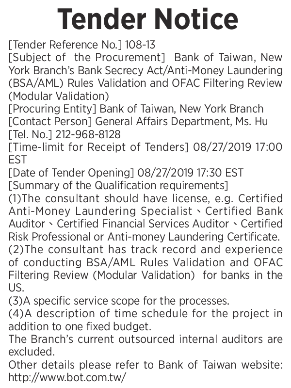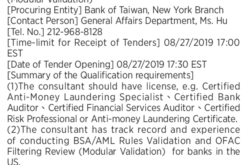 [Subject of the Procurement] Bank of Taiwan, New York Branch’s Bank Secrecy Act/Anti-Money Laundering (BSA/AML) Rules Validation and OFAC Filtering Review (Modular Validation)