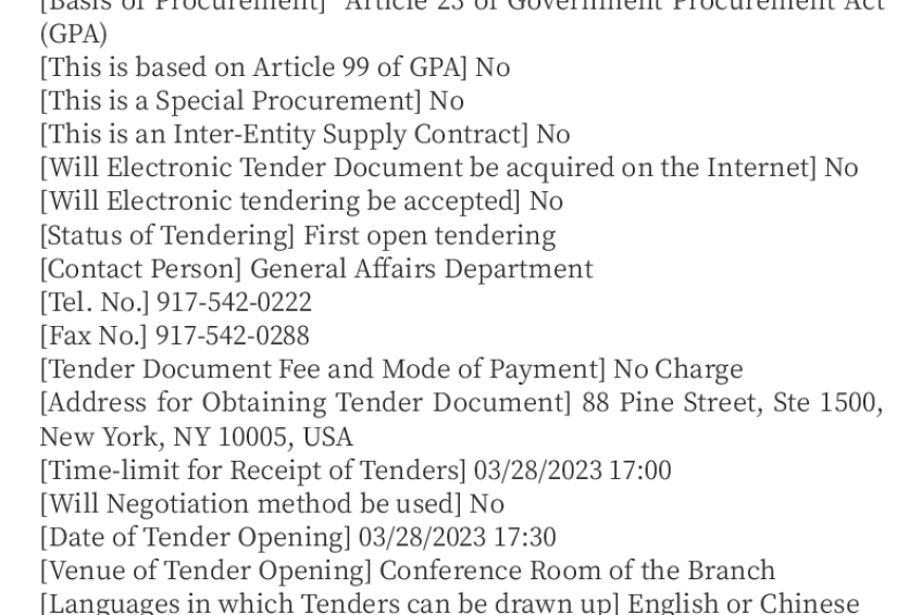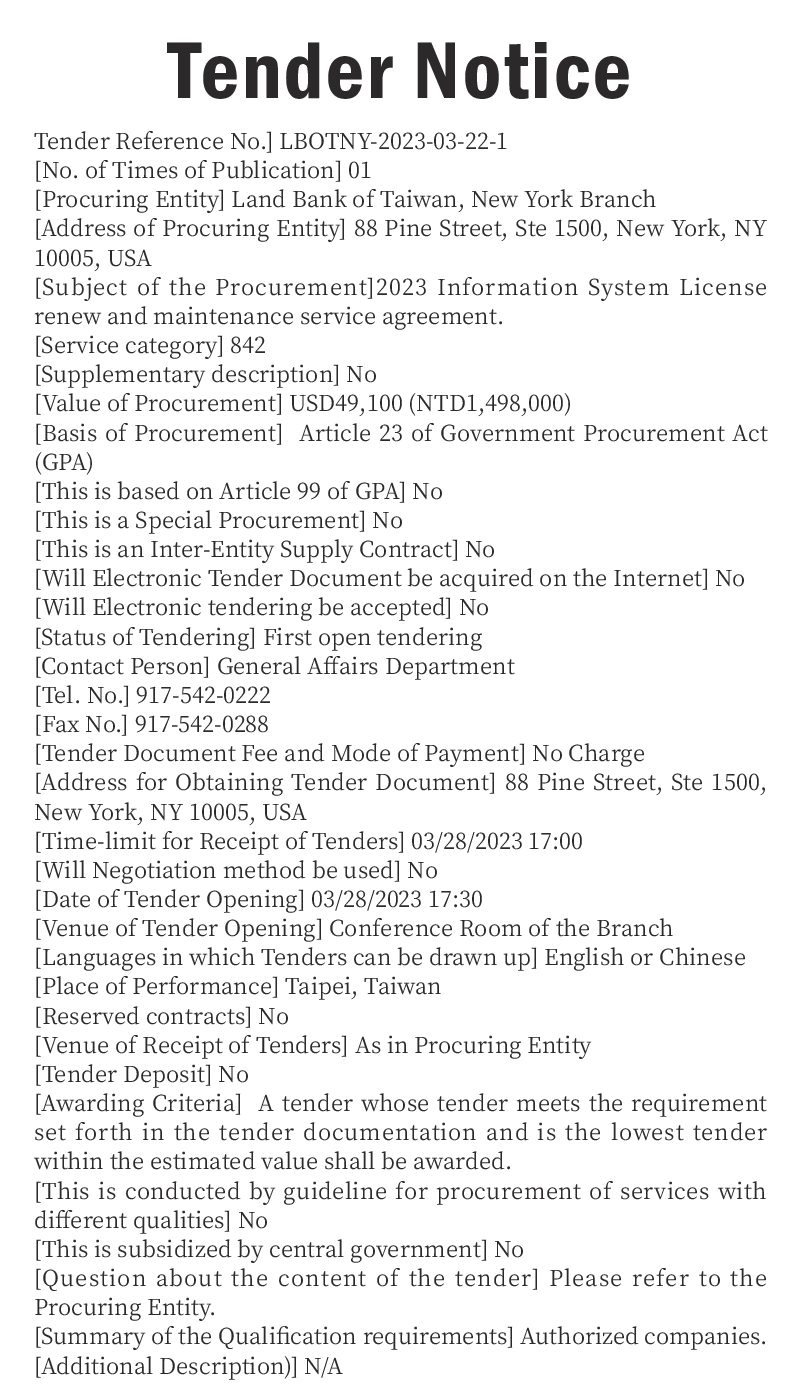 [Procuring Entity] Land Bank of Taiwan, New York Branch