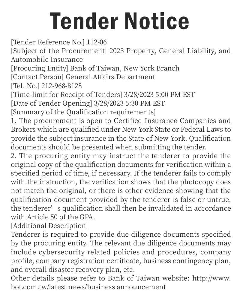 [Procuring Entity] Bank of Taiwan, New York Branch