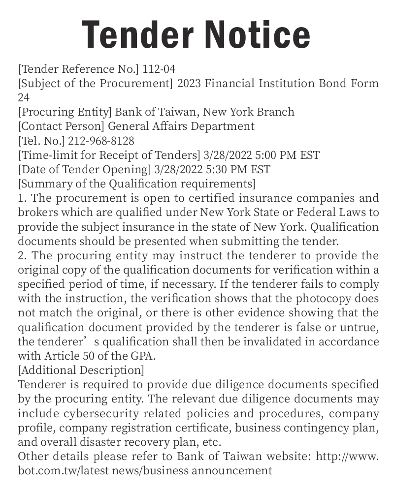 [Procuring Entity] Bank of Taiwan, New York Branch