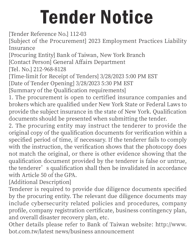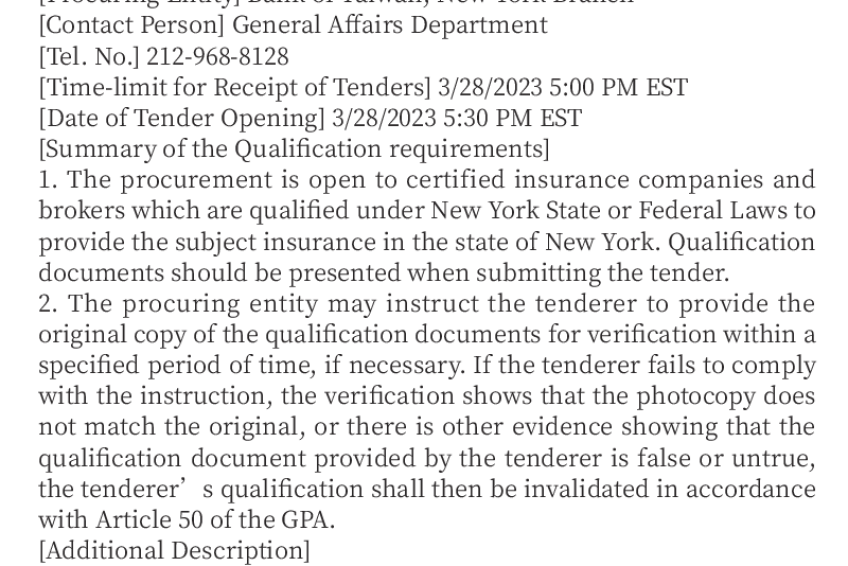 [Procuring Entity] Bank of Taiwan, New York Branch