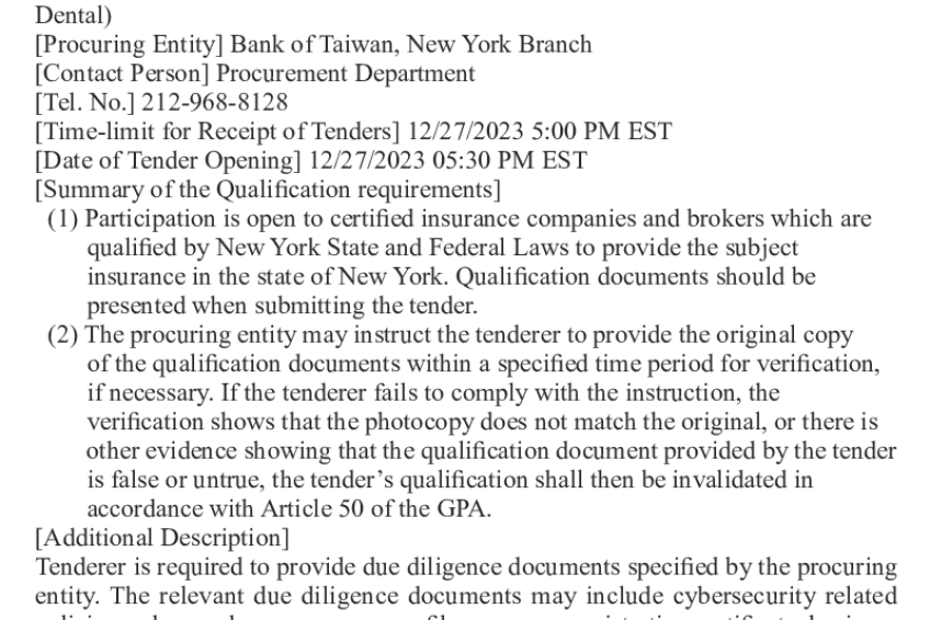 [Procuring Entity] Bank of Taiwan, New York Branch