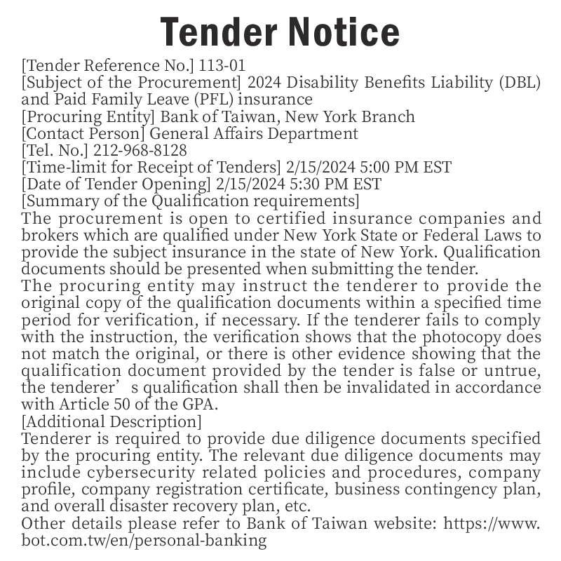 [Procuring Entity] Bank of Taiwan, New York Branch