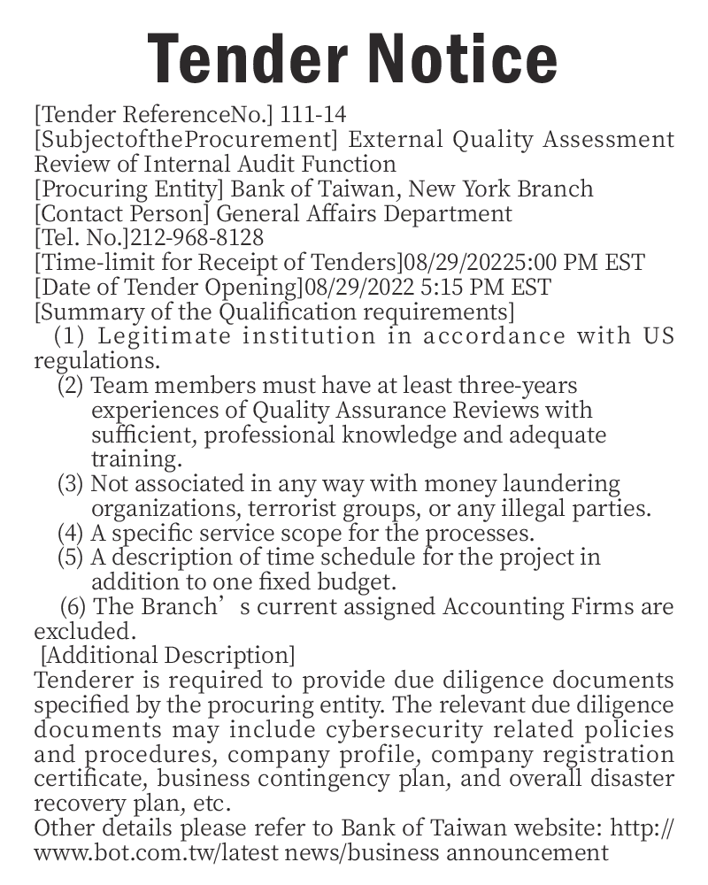 [Procuring Entity] Bank of Taiwan, New York Branch