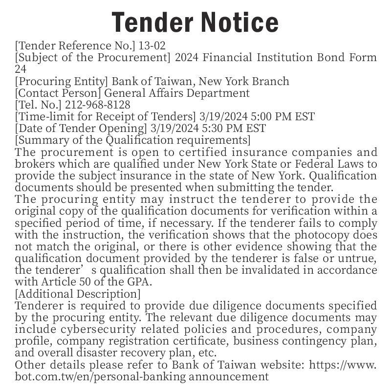 [Tender Reference No.] 13-02 [Subject of the Procurement] 2024 Financial Institution Bond Form 24 [Procuring Entity] Bank of Taiwan, New York Branch [Contact Person] General Affairs Department [Tel. No.] 212-968-8128 [Time-limit for Receipt of Tenders] 3/19/2024 5:00 PM EST [Date of Tender Opening] 3/19/2024 5:30 PM EST [Summary of the Qualification requirements] The procurement is open to certified insurance companies and brokers which are qualified under New York State or Federal Laws to provide the subject insurance in the state of New York. Qualification documents should be presented when submitting the tender. The procuring entity may instruct the tenderer to provide the original copy of the qualification documents for verification within a specified period of time, if necessary. If the tenderer fails to comply with the instruction, the verification shows that the photocopy does not match the original, or there is other evidence showing that the qualification document provided by the tenderer is false or untrue, the tenderer’s qualification shall then be invalidated in accordance with Article 50 of the GPA. [Additional Description] Tenderer is required to provide due diligence documents specified by the procuring entity. The relevant due diligence documents may include cybersecurity related policies and procedures, company profile, company registration certificate, business contingency plan, and overall disaster recovery plan, etc.