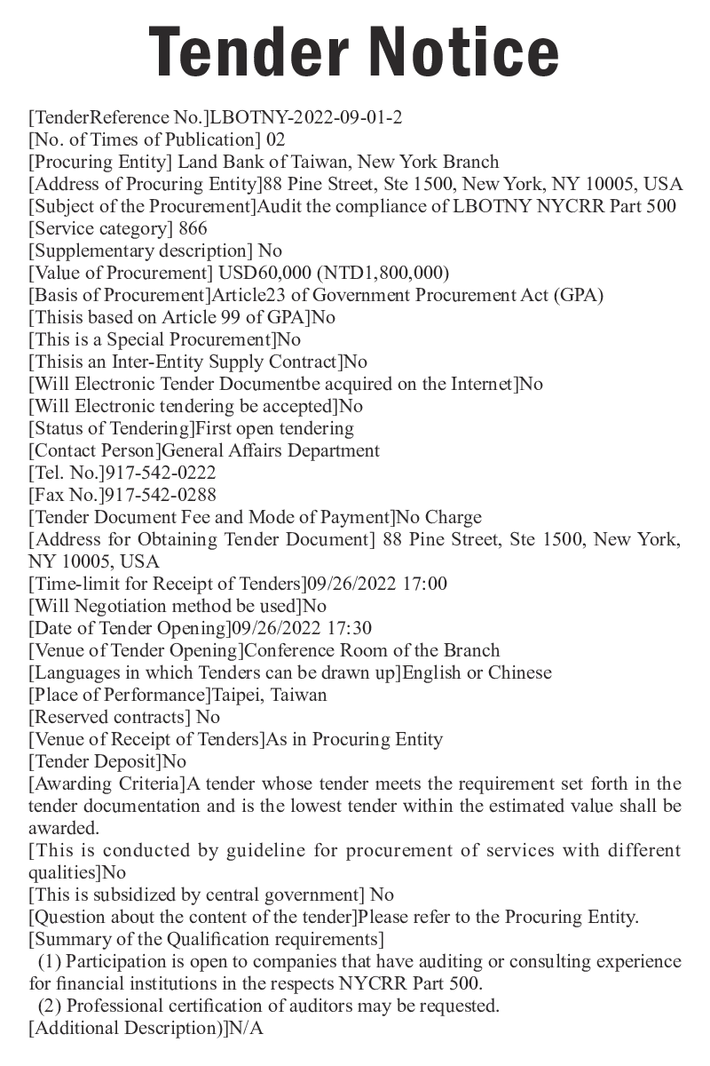 [Procuring Entity] Land Bank of Taiwan, New York Branch