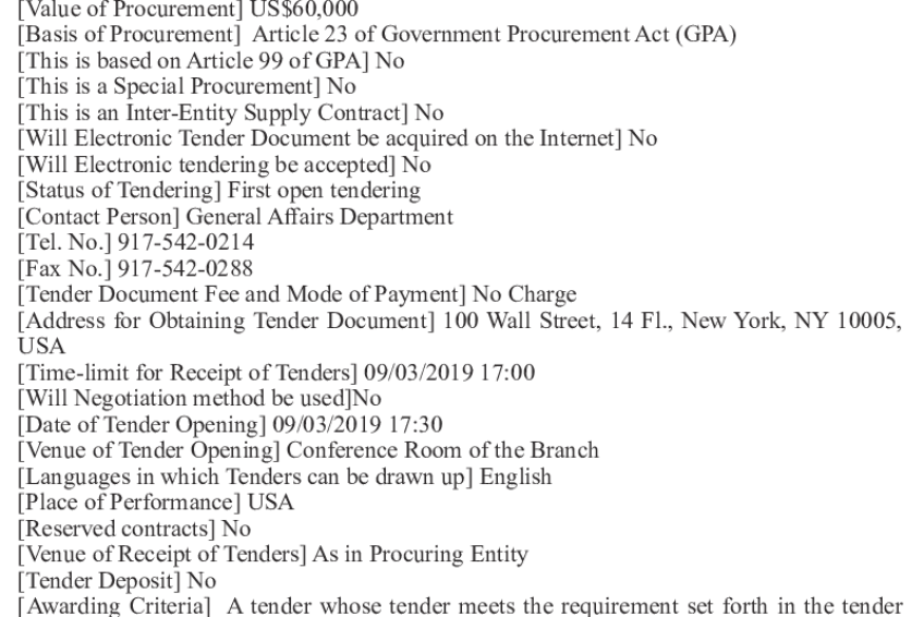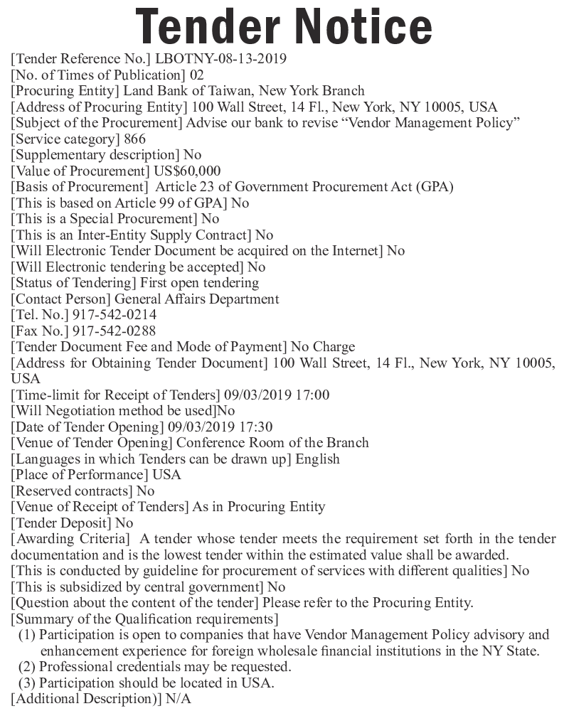 [Procuring Entity] Land Bank of Taiwan, New York Branch