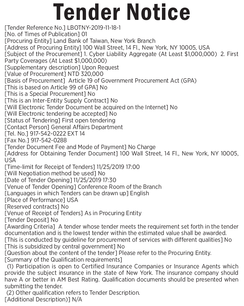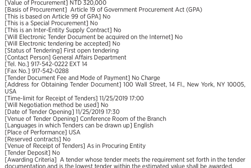 [Procuring Entity] Land Bank of Taiwan, New York Branch