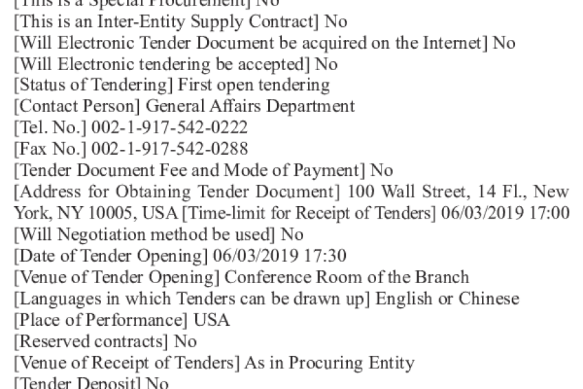 [Address for Obtaining Tender Document] 100 Wall Street, 14 Fl., New York, NY 10005, USA [Time-limit for Receipt of Tenders] 06/03/2019 17:00