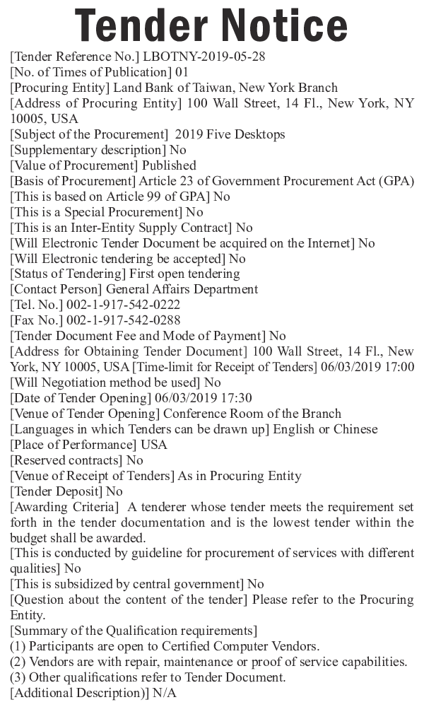 [Procuring Entity] Land Bank of Taiwan, New York Branch