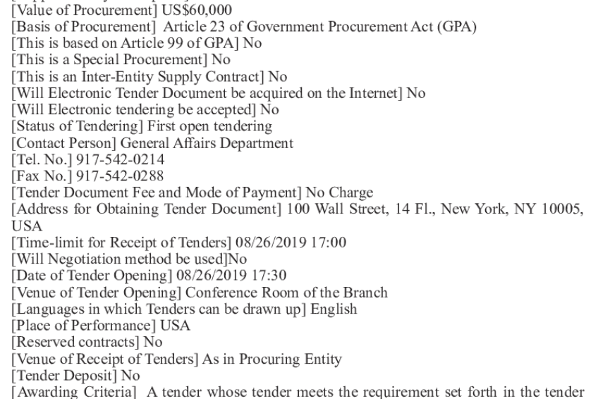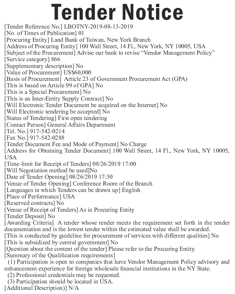 [Procuring Entity] Land Bank of Taiwan, New York Branch