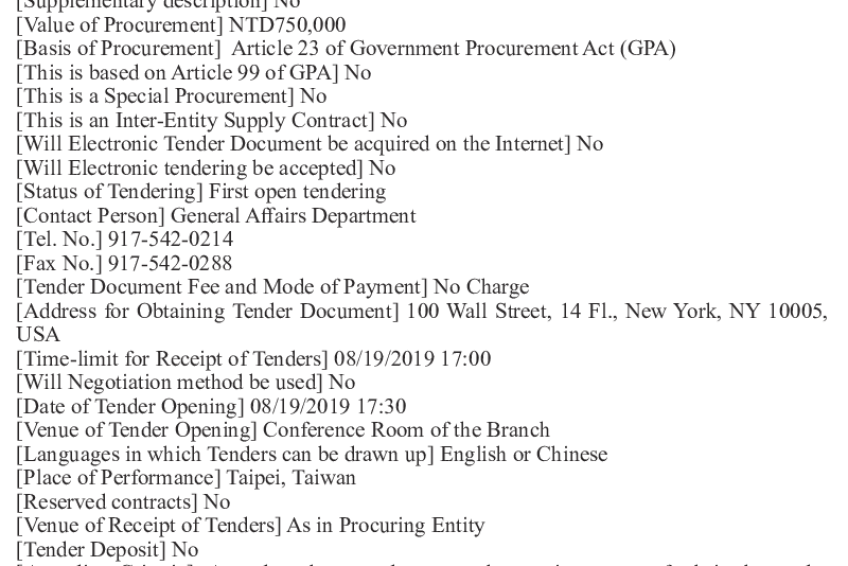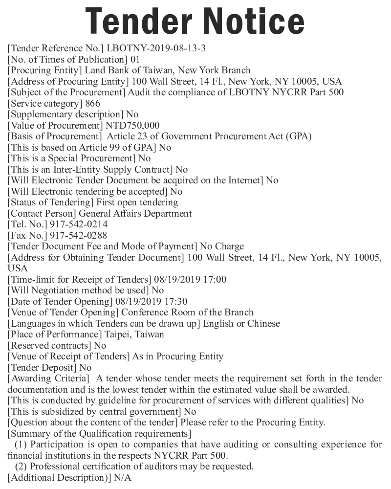 [Procuring Entity] Land Bank of Taiwan, New York Branch