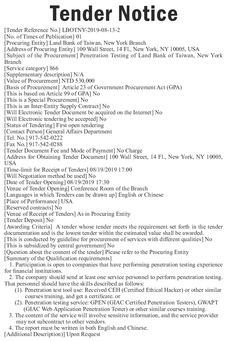 [Subject of the Procurement] Penetration Testing of Land Bank of Taiwan, New York Branch