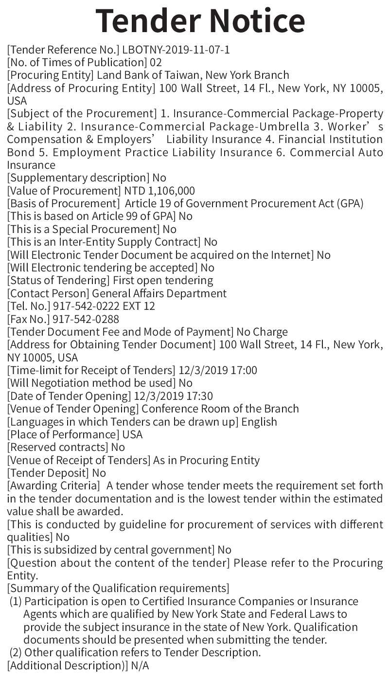 [Procuring Entity] Land Bank of Taiwan, New York Branch