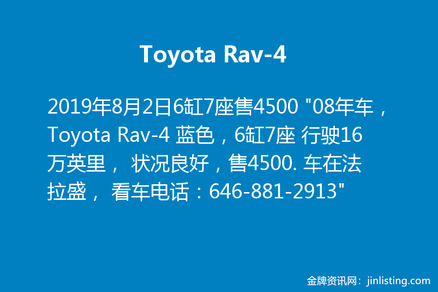 Toyota Rav-4 6缸7座售4500 “08年车,Toyota Rav-4 蓝色,6缸7座 行驶16万英里, 状况良好,售4500. 车在法拉盛, 看车电话:646-881-2913”