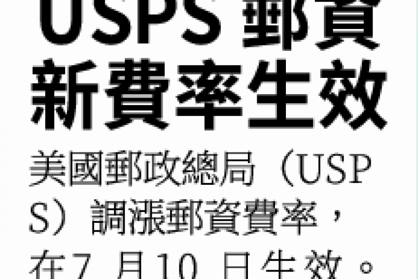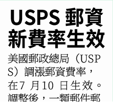 美國郵政總局(USPS)調漲郵資費率,在7 月10 日生效。