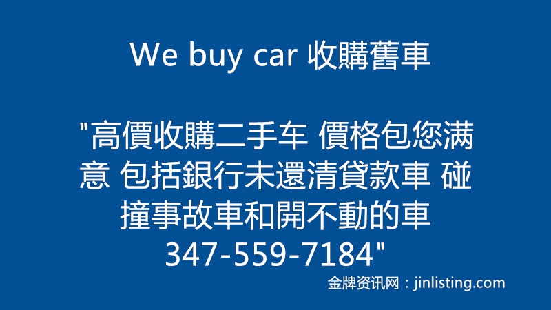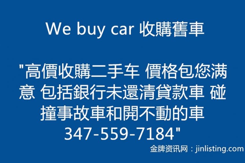 We buy car 收購舊車 “高價收購二手车 價格包您满意 包括銀行未還清貸款車 碰撞事故車和開不動的車 347-559-7184”