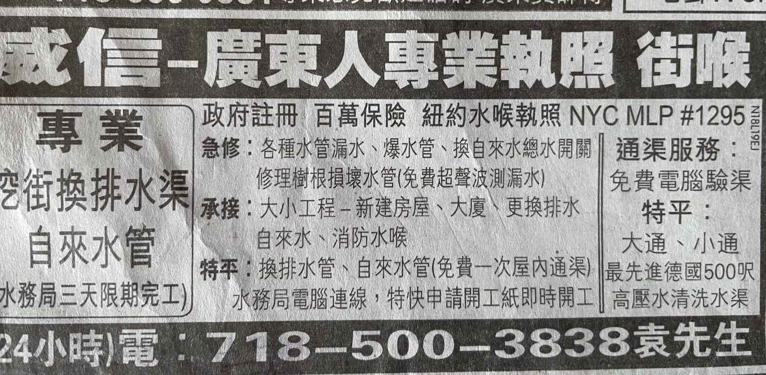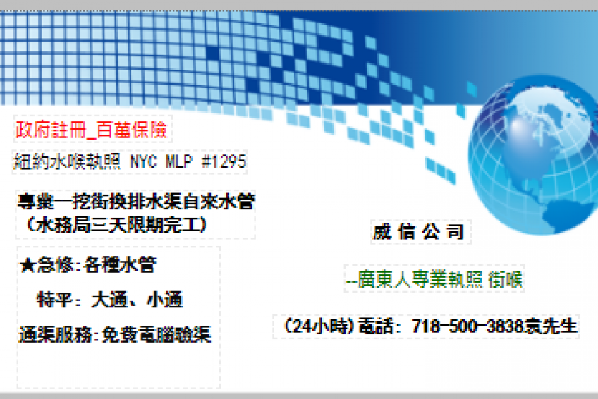 本公司持有政府注册“纽约水喉执照” NYC MLP #1295百万保险。