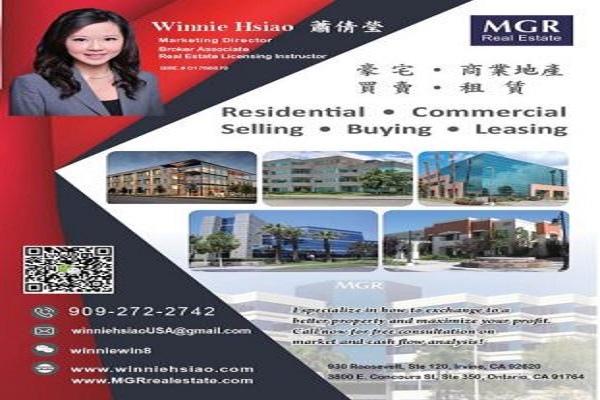 Winnie Hsiao 萧为全职专业全职地产经纪。 专精东区等区包括钻石岗丶核桃市丶奇诺岗及邻近城市及尔湾丶新港滩等地区。 目前担任MGR地产公司地产职照班讲师, 拥有房地产BROKER职照。