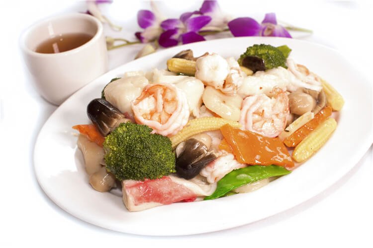 S29. Stir Fried Seafood & Chicken a chinese culinary tradition, splendid combination of scallops, shrimp & sliced chicken precisely balanced with green scallops.  9.95