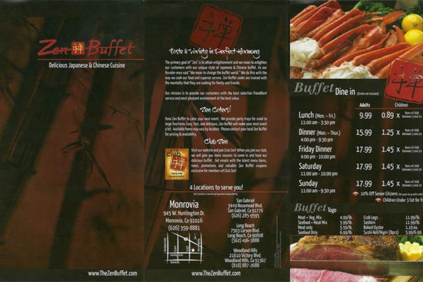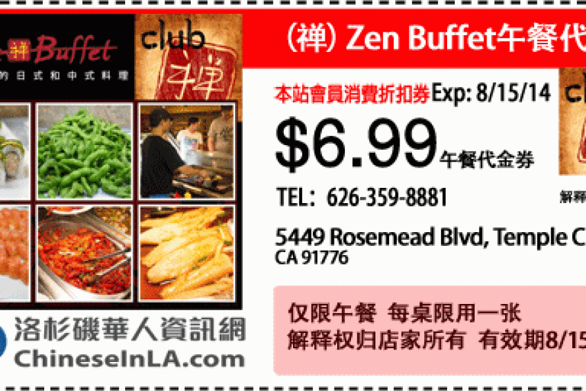 「Zen禪Buffet」位於聖蓋博市柔似蜜大道上,地方寬敞,近萬尺場地,可容納二百八十人,擁有貴賓房丶卡拉OK房,環境舒適,適合朋友聚餐丶請客,舉辦生日Party都是尚好的選擇,當日生日者還可享免費用餐。老闆Mei待人熱情丶真誠,張大廚是「Zen禪Buffet」的創始人之一,超過二十年的buffet經驗,在Mei和張大廚的主理下,講究的是食材新鮮,用料上乘,經常帶給客人驚喜。餐廳對廚師要求很高,最近新聘紐約過來的法式一級料理師付,做出來的壽司像藝術品,色澤漂亮,十分誘人。 「Zen禪 Buffet」全天供應各種美食,應有盡有,清蒸活螃蟹丶阿拉斯加蟹腳丶香辣小龍蝦丶串燒雞牛羊肉等。這裡的炭燒烤生蠔,挑選新鮮大隻的當場連殼烤出來,味道鮮美,帶有海味。現點現煮的特色烏冬麺,牛肉丶豬肉丶雞肉丶蘑菇丶金針菇丶蔬菜等由廚師當場按個人喜好做出來。德州燒烤牛肉,用整塊肉來烤,火候拿捏的好,當場切給客人,厚薄自己選,淋上醬料,特別的美味,充滿著牛肉的香味,吃起來特別的嫩,受到一致的好評。這裡的日式料理也很豐富,有品種繁多的生魚片丶各類壽司可比美日本餐廳,中式也有蒸魚丶西汁核桃蝦丶紅燜牛肉丶雞翅膀,而美容蹄柔軟可口,是女士們的摯愛。 「Zen禪 Buffet」也有多種多樣的甜點,泡芙丶提拉米蘇丶巧克力蛋糕丶水果蛋糕等,還有香草和巧克力味道的優格,水果亦豐盛多不勝舉,足夠消費者挑選品嚐。 「Zen禪 Buffet」的經營宗旨為煮優質食物,提供優質服務,對待客人像對待自己的家人和朋友一樣。該餐廳價格公道合理,午餐平日特別優惠每人$9.59,下午四點開始晚餐,平日每人$14.99,週末$16.99,週六和周日從上午11點到晚上10點一律為$16.99,另外每逢週二,年齡超過62歲者可享有35%折扣,還有剪下台灣時報和中國日報折扣券$2,可抵扣餐費。