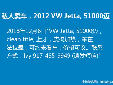 私人卖车,2012 VW Jetta, 51000迈, $7500 917-485-9949