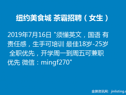 纽约美食城 茶霸招聘(女生)微信:mingf270″