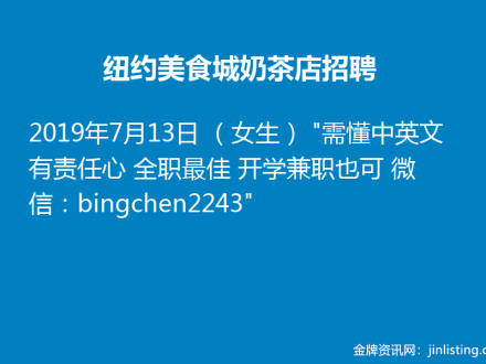 纽约美食城奶茶店招聘 微信:bingchen2243″