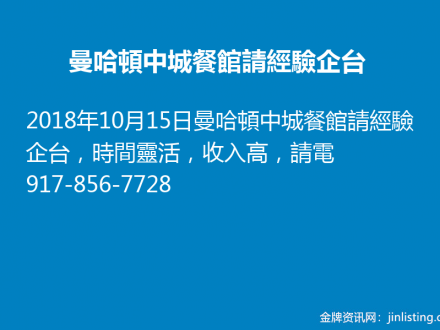 曼哈頓中城餐館請經驗企台917-856-7728