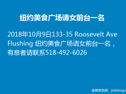 纽约美食广场请女前台一名518-492-6026