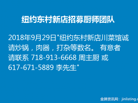 纽约东村新店招募厨师团队 718-913-6668