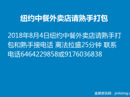 纽约中餐外卖店请熟手打包9176036838