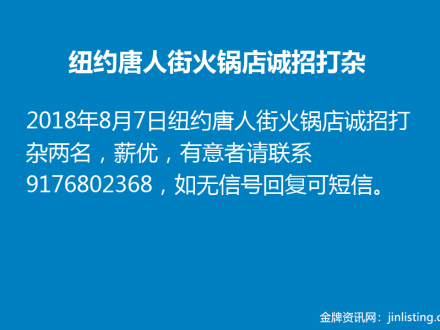 纽约唐人街火锅店诚招打杂9176802368