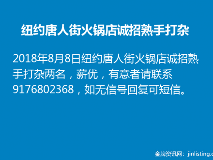 纽约唐人街火锅店诚招熟手打杂9176802368
