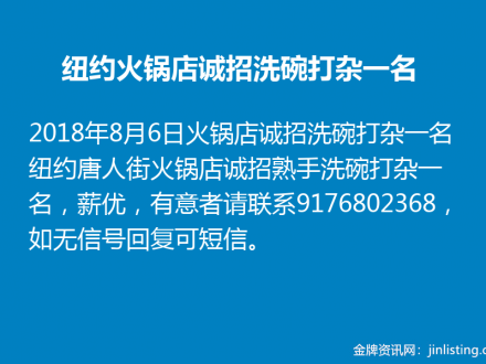 纽约火锅店诚招洗碗打杂一名 9176802368