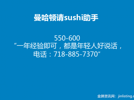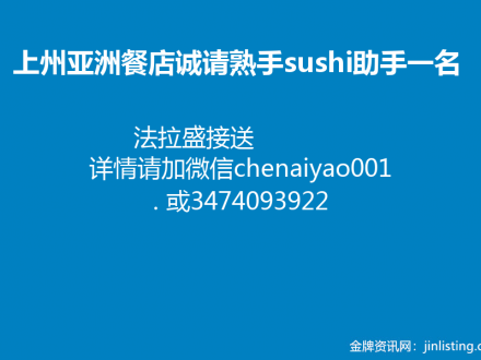 上州亚洲餐店 诚请熟手sushi助手一名 微信chenaiyao001. 或3474093922