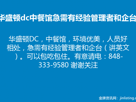 华盛顿DC,中餐馆 急需有经验管理者和企台(讲英文) 848-333-9580 谢谢关注