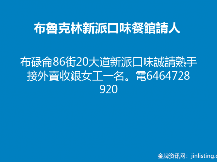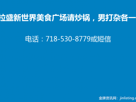 法拉盛新世界美食广场请炒锅,男打杂各一名 718-530-8779