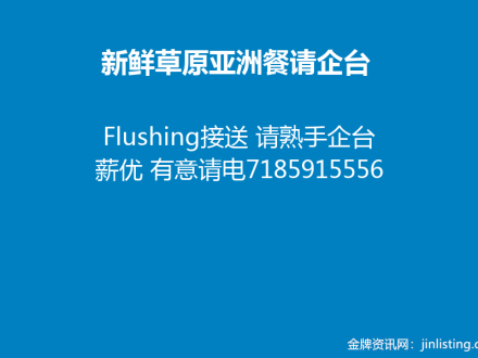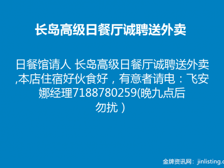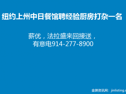 纽约上州中日餐馆聘经验厨房打杂一名 914-277-8900