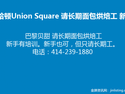 曼哈顿Union Square 附近巴黎贝甜 请长期面包烘焙工 新手也召 414-239-1880″
