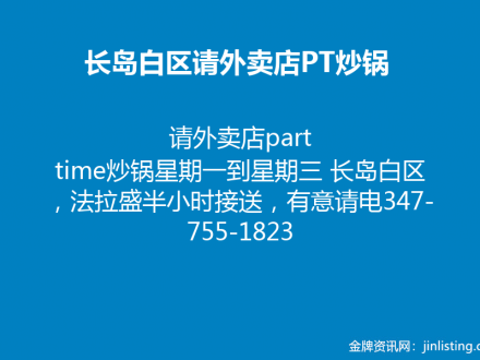 长岛白区请外卖店part time炒锅星期一到星期三 347-755-1823
