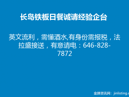 长岛铁板日餐诚请经验企台 :646-828-7872