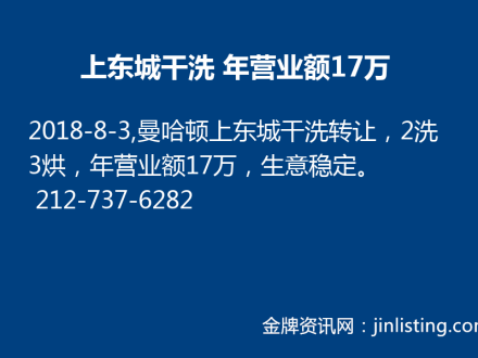上东城干洗 年营业额17万,生意稳定。 电话: 212-737-6282
