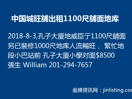 中国城旺舖出租孔子大厦地威臣亍1100 尺舖面+1000 尺地库出租,电话:201-294-7657
