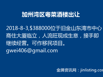 加州湾区粤菜酒楼出让 电话:51068-70400