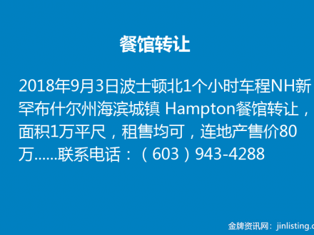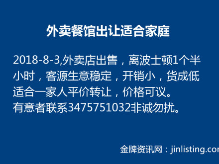 外卖餐馆出让合家庭 离波士顿1个半小时 联系3475751032非诚勿扰
