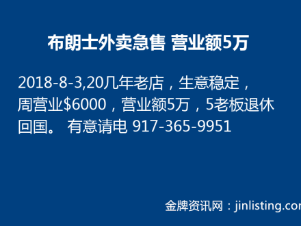 布朗士外卖急售 营业额5万 有意请电 917-365-9951