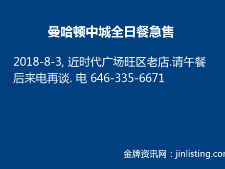 曼哈顿中城全日餐急售,请午餐后来电再谈. 电 646-335-6671