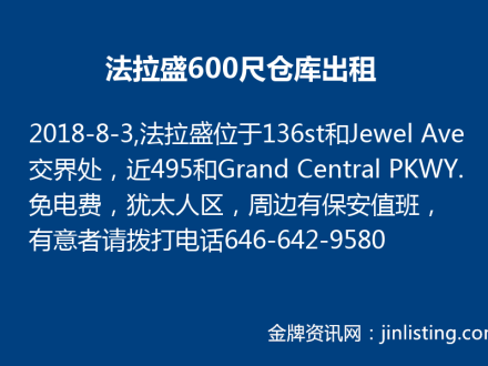 600尺仓库出租,法拉盛136街和Jewel Ave交界处 电话646-642-9580
