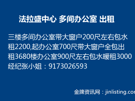 法拉盛中心 多间办公室 出租, 约看电经纪张小姐:9173026593